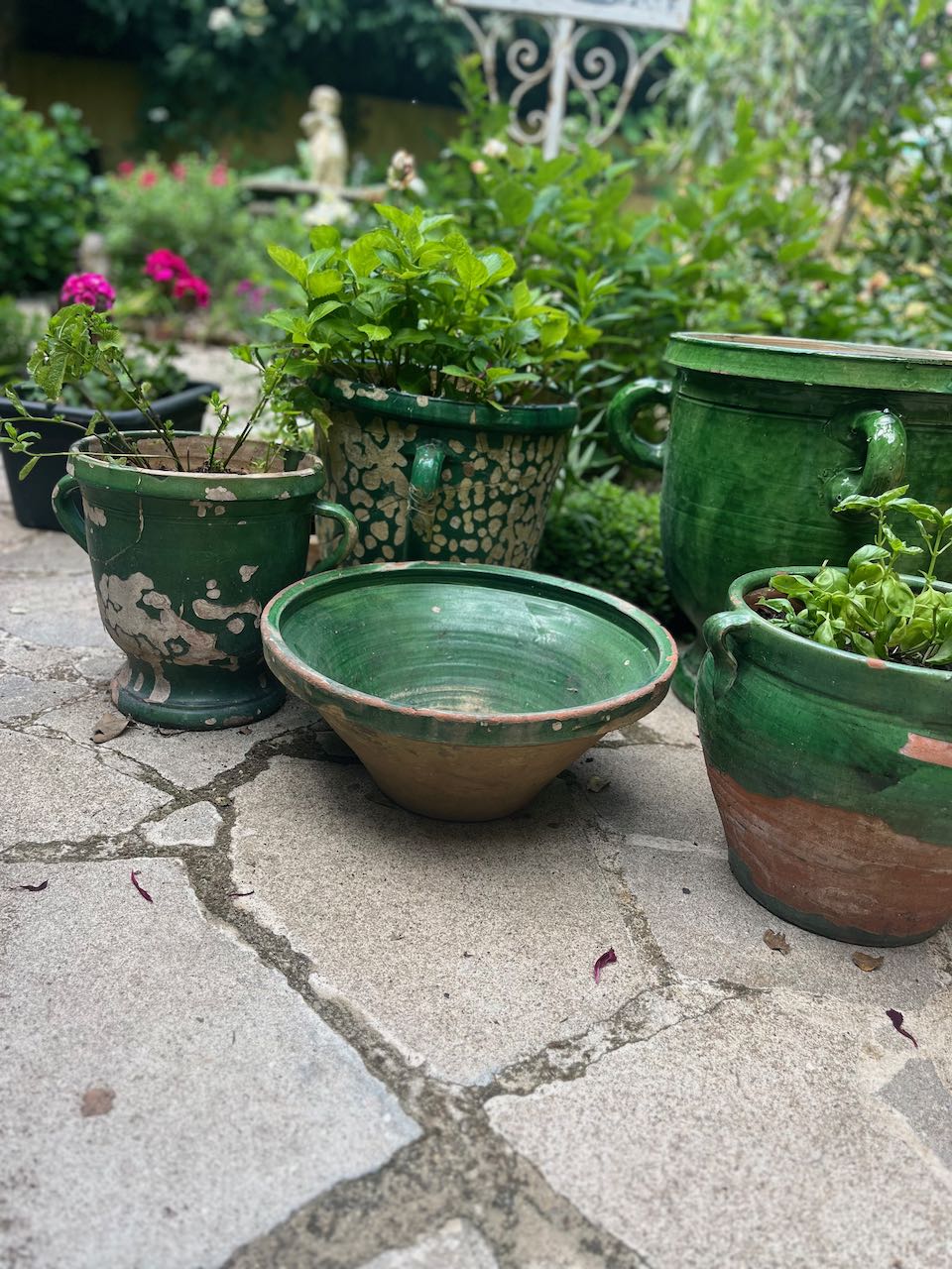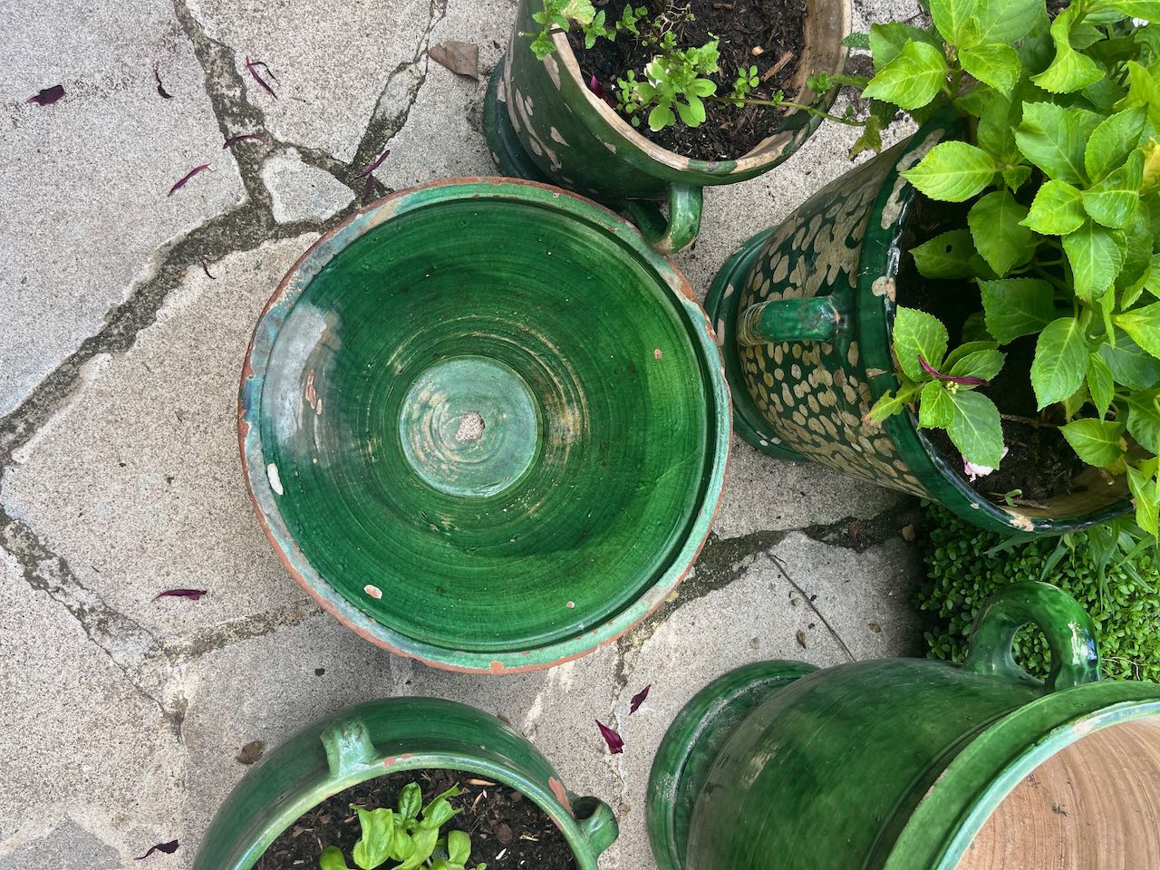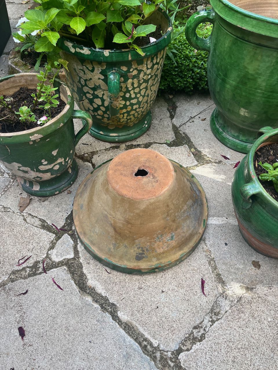 Gorgeous colour and shape.Handmade on a wheel. French antique. It has a hole at the bottom whcih could be utilised as a planter pot 44 across top x a8 h