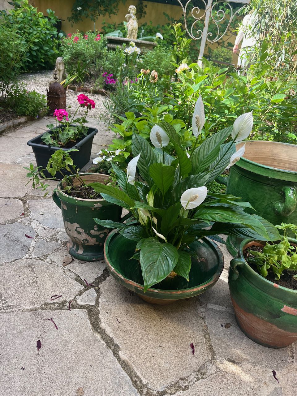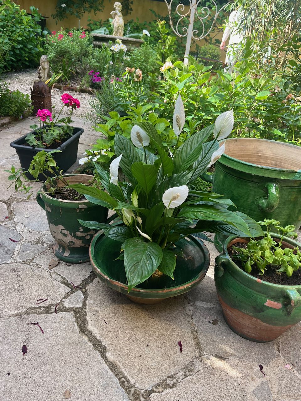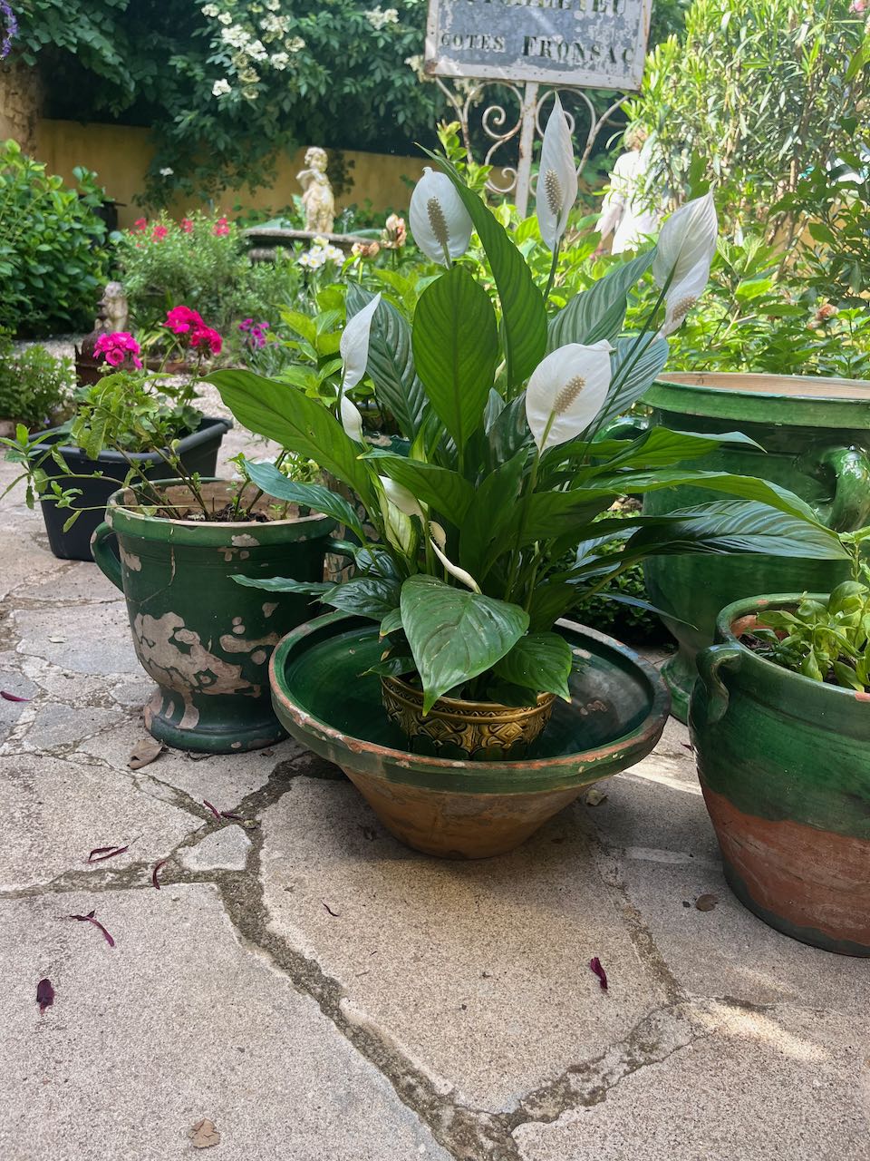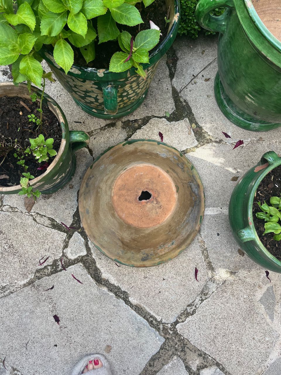Gorgeous colour and shape.Handmade on a wheel. French antique. It has a hole at the bottom whcih could be utilised as a planter pot 44 across top x a8 h