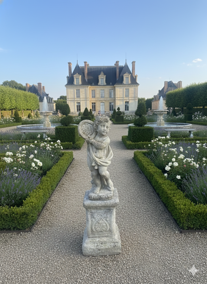 I bought these beauties from a Chateau near Agen, in the South west of France. They are each playing a different instrument. The statue for sale is playing a tambourine and comes standing on a plinth. Very heavy. 1.15 metres high and 32 wide ( plinth) I have 2 for sale, the other is available on fa665