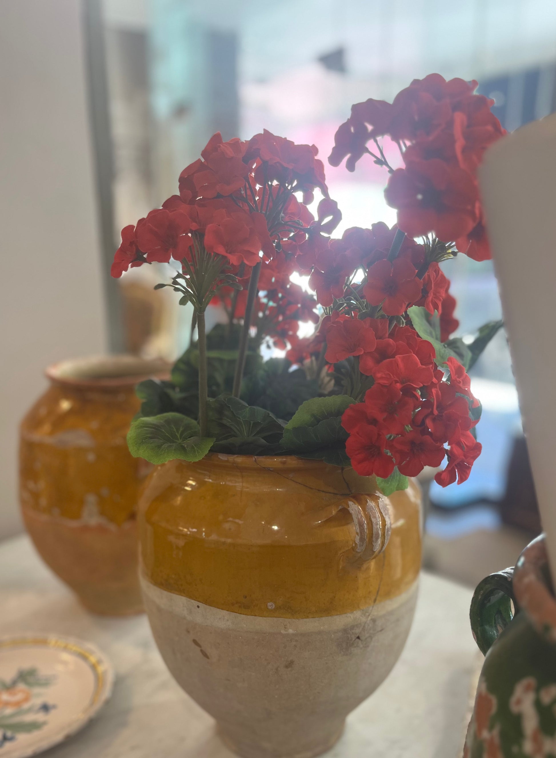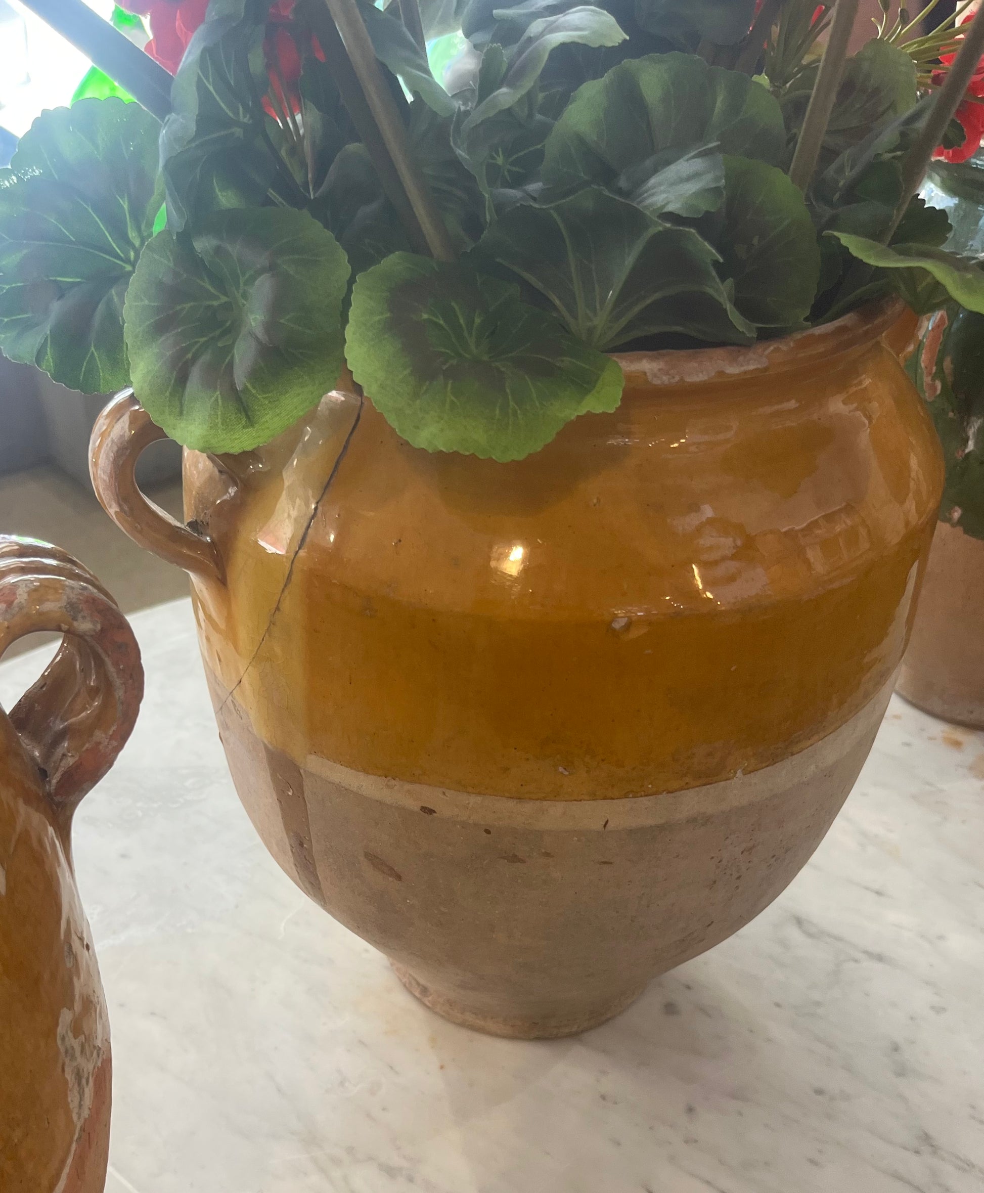 A beautiful Shape and colour but has cracks on the body which is still solid. Two intact handles. 32 wide with handles and 33 high. they make wonderful vases with a jar inside for holding the water or add to a collection.