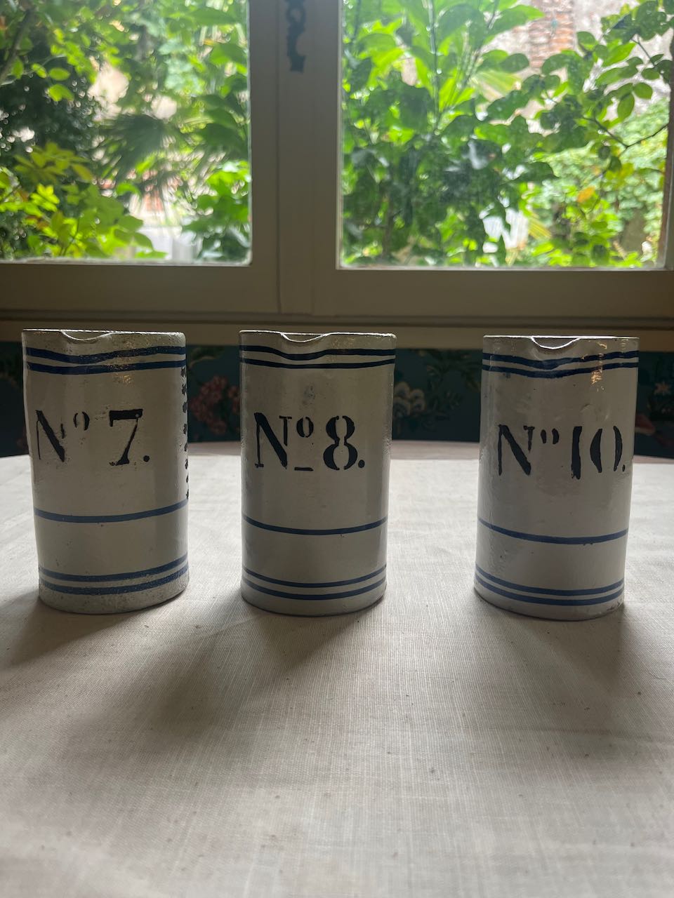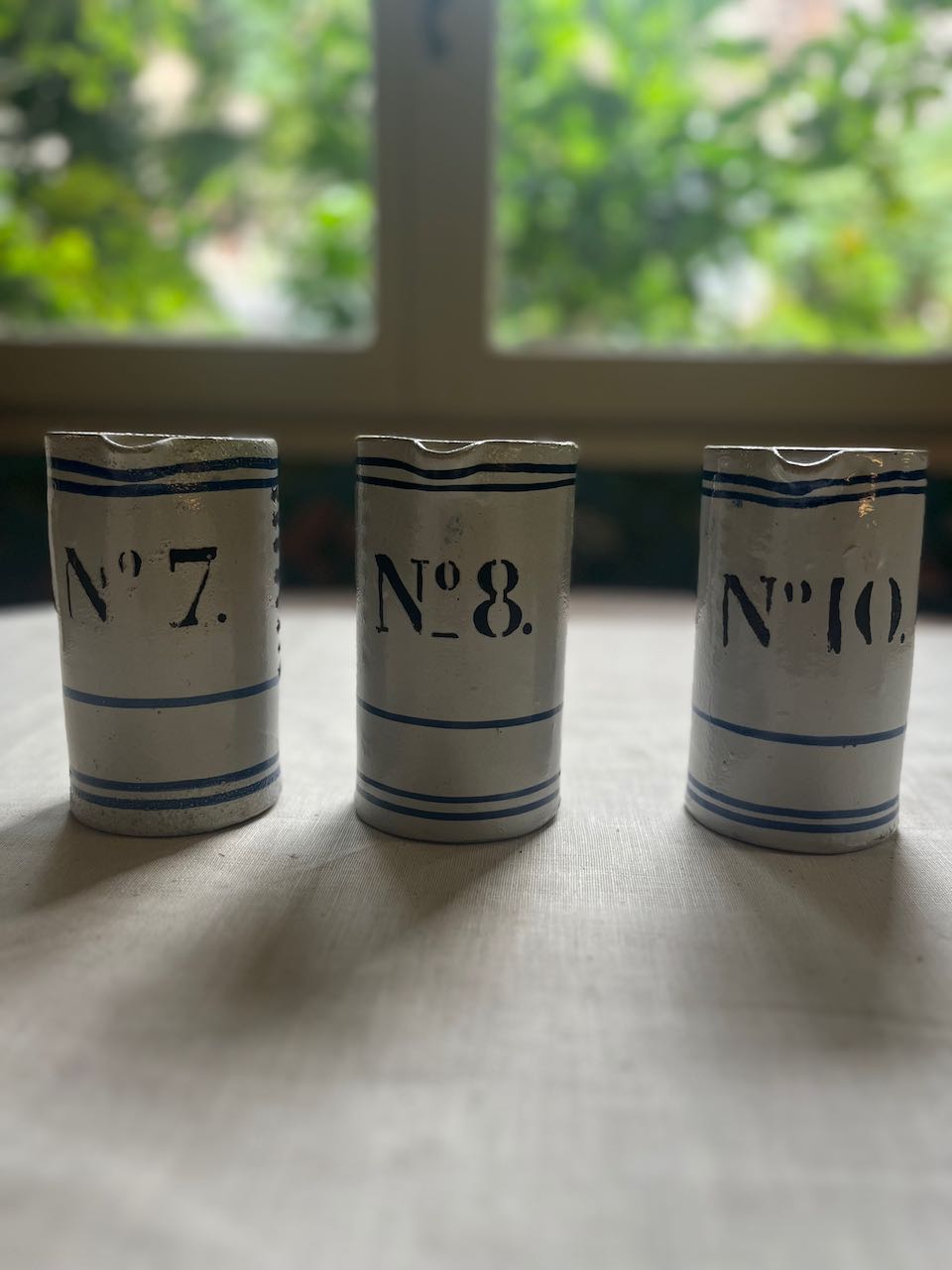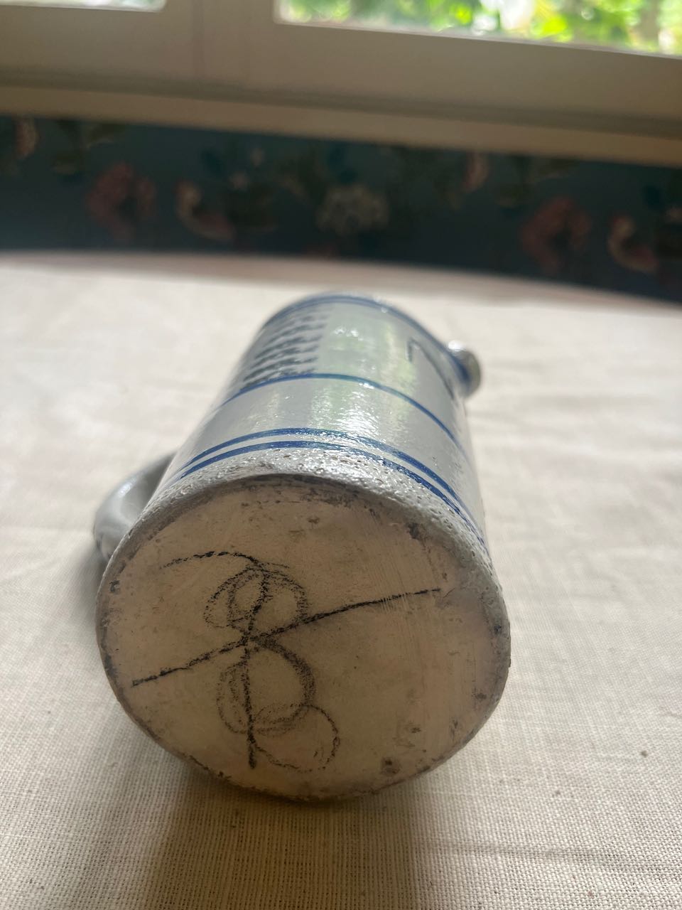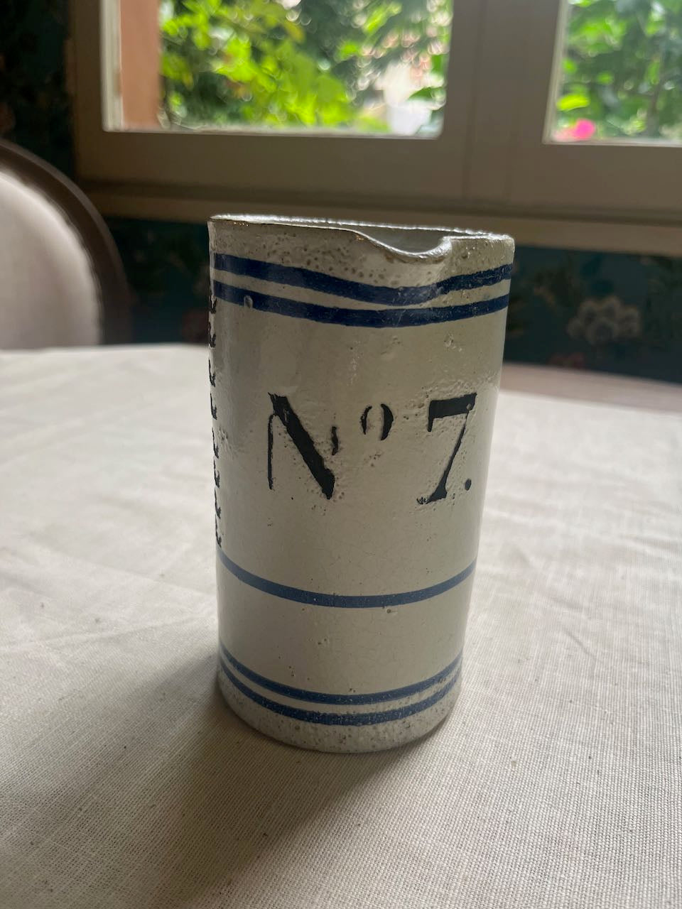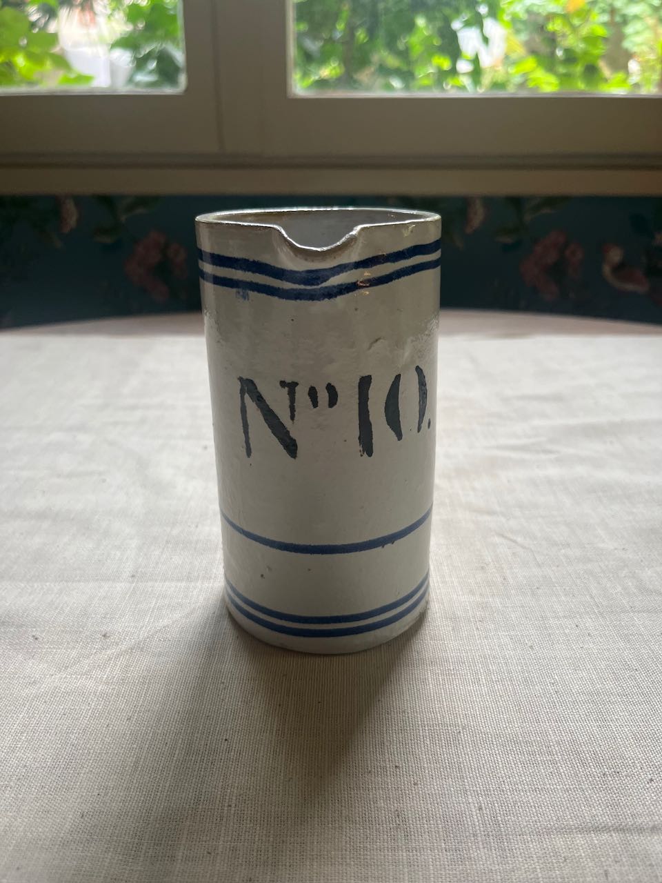 Stoneware Antique jugs that were originally used for drinking beer. The number painted on the front was a way of identifying the individuals jug at a pub. They are not big, about a glass size. They would make a lovely vase. or milk/cream jug. Selling individually