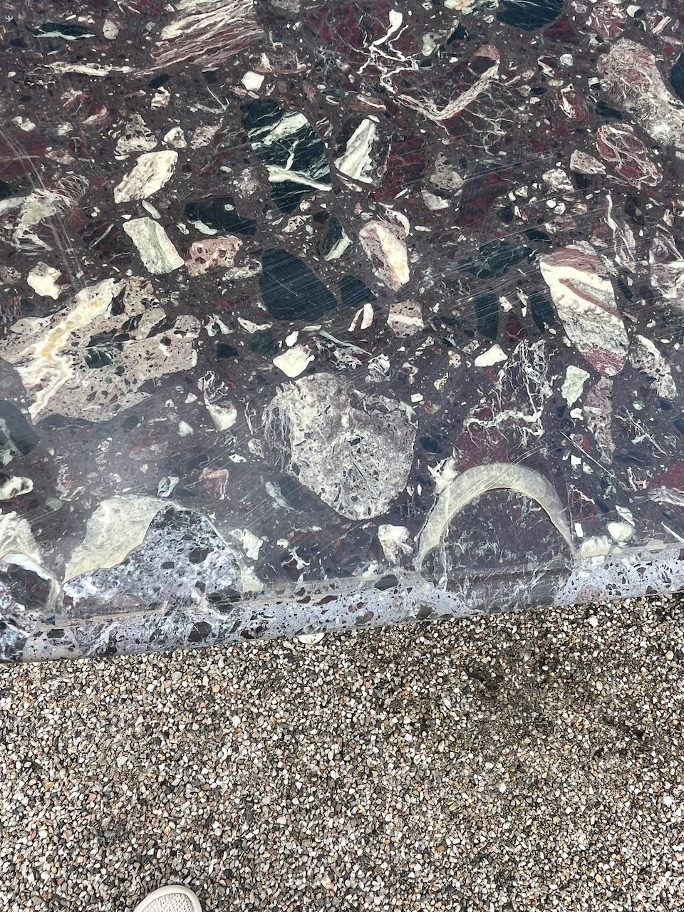 Black marble top with white painted metal legs. There are a few spots where the resin on the top has peeled away exposing raw marble but still a gorgeous table. 52x105 x154