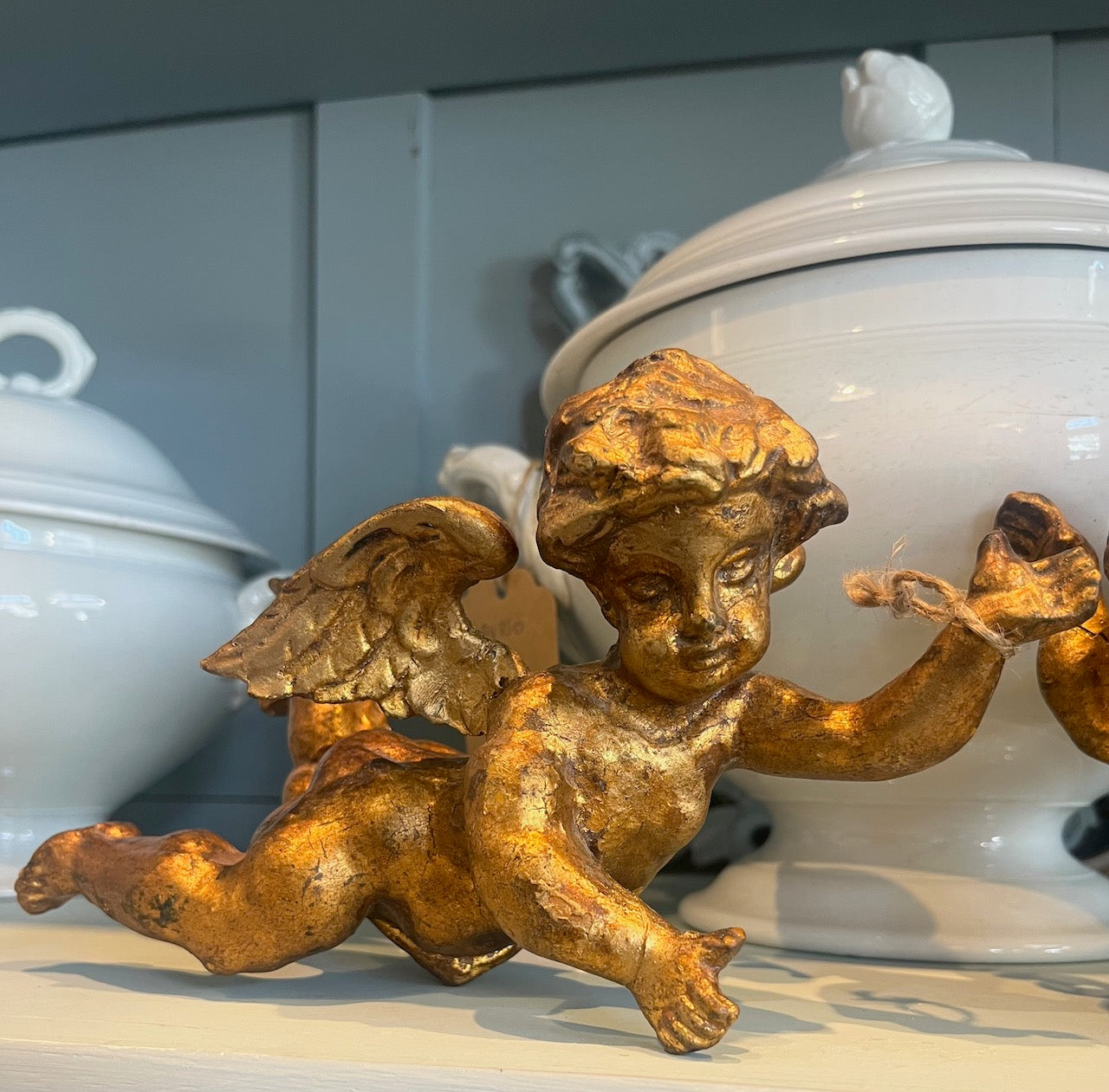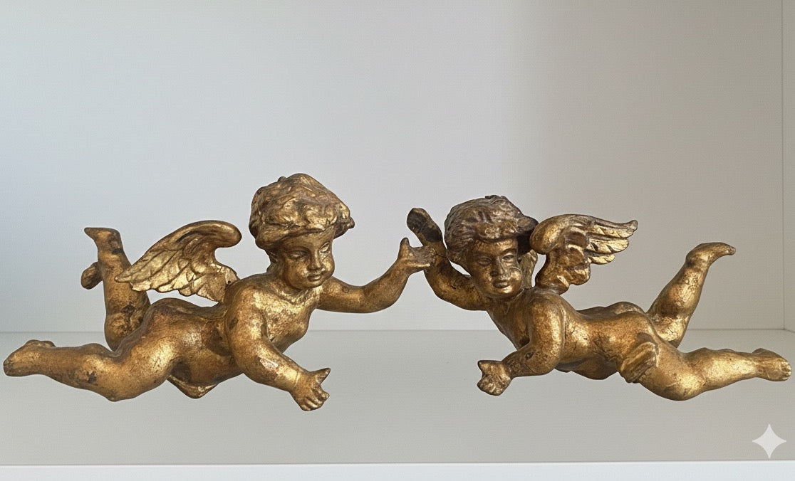 Stunning gilded Putti gilded and made from wood and plaster. Light to hang. There is a little hole in the sides that was used to hang them originally. 22 cm long each one