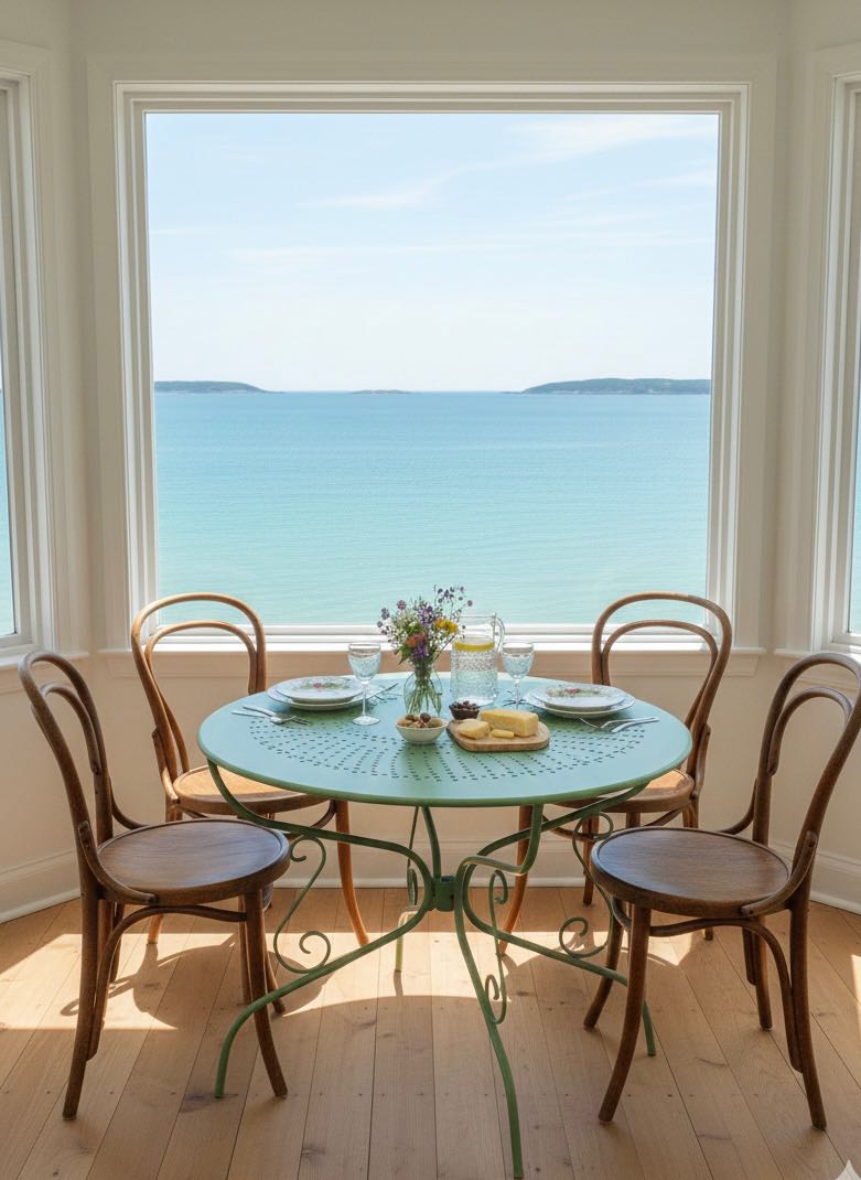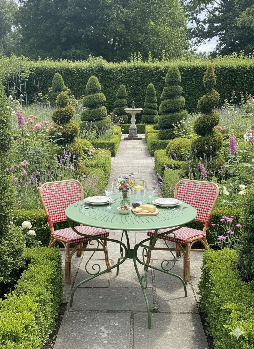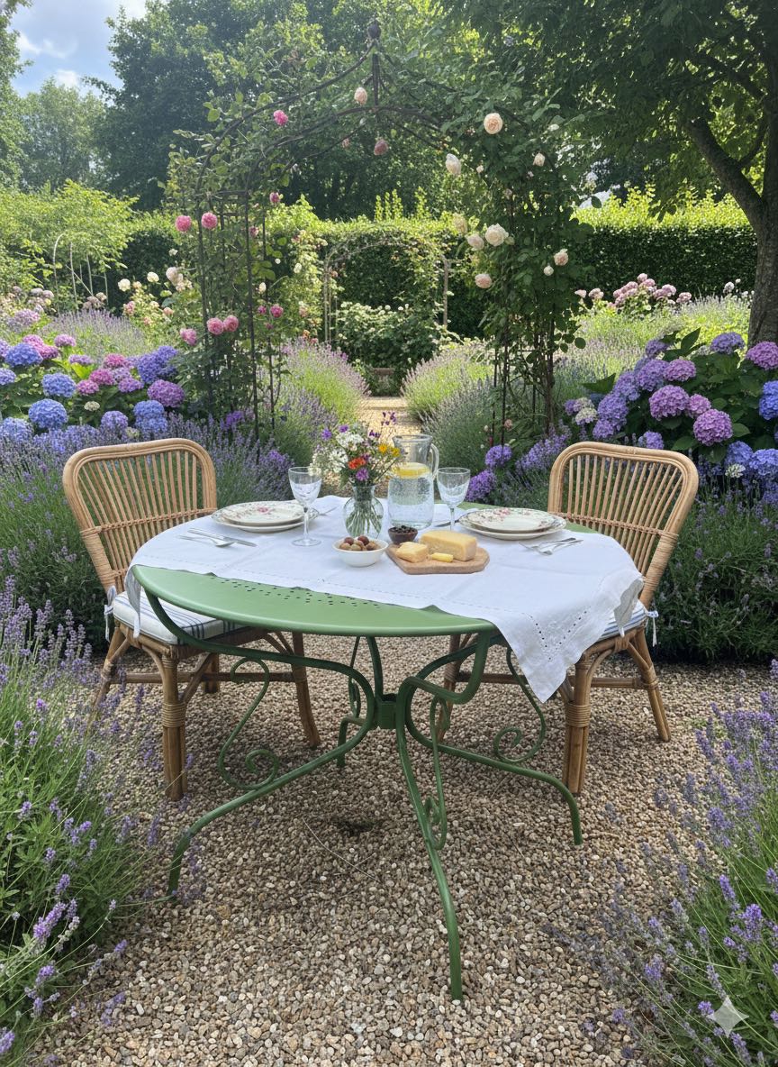 French vintage cafe table, repainted. 95 x 73 high Stunning in a garden setting or even a small inside table or verandah. Multi use. folds up for storage. A few created shots to see what it can look like inside and out!
