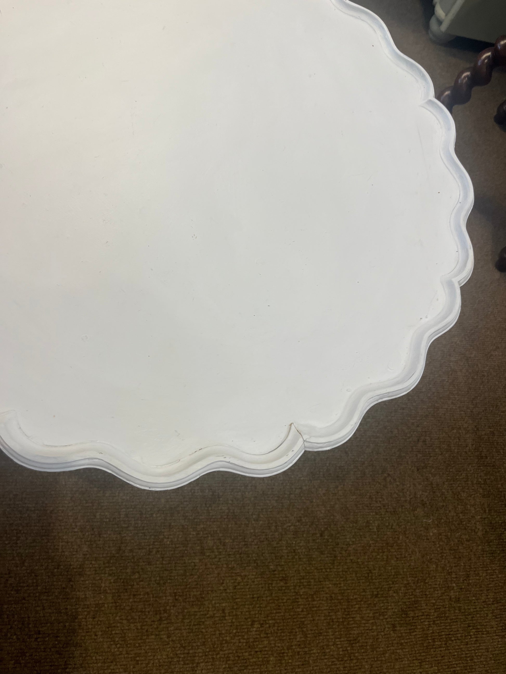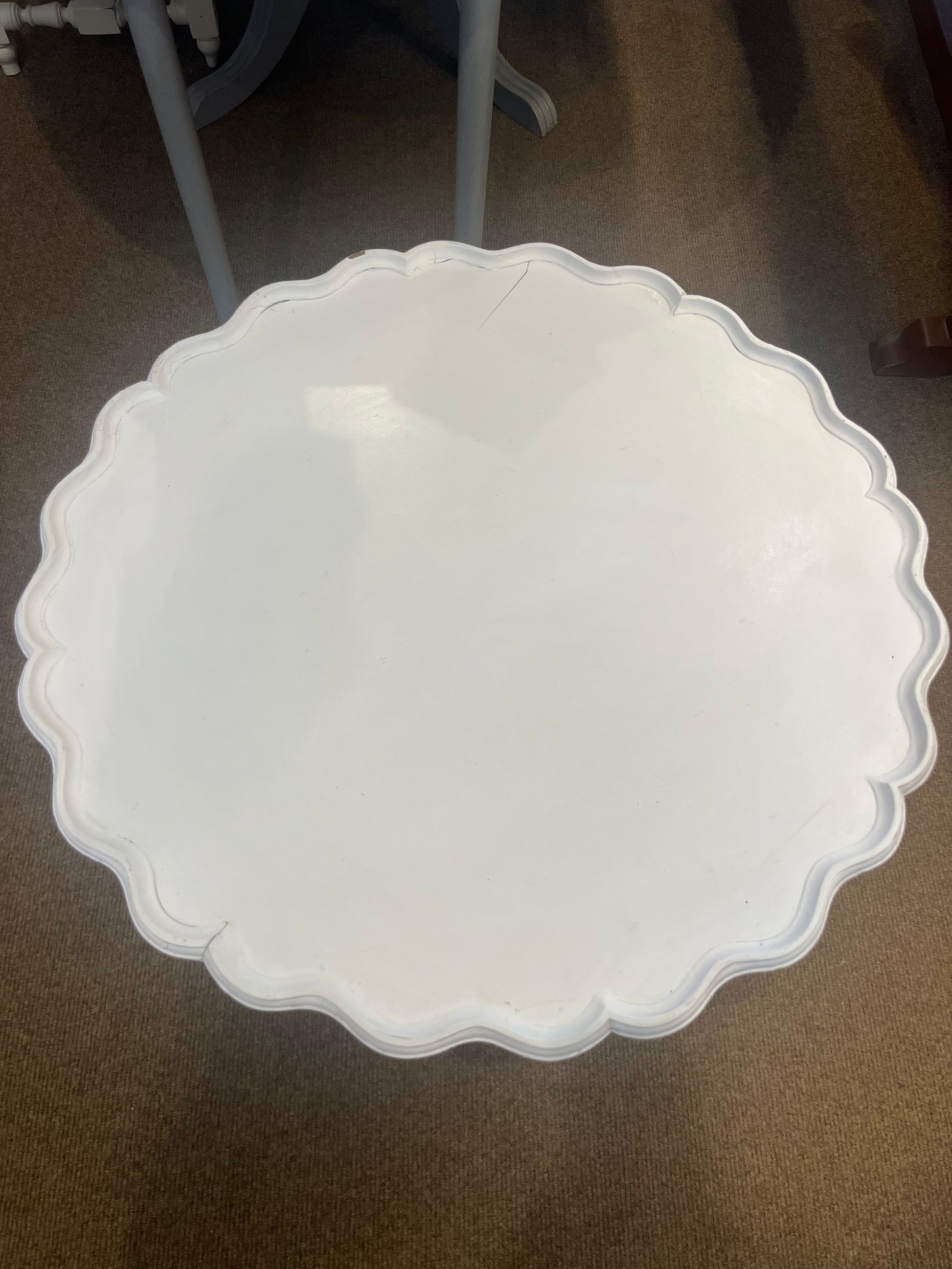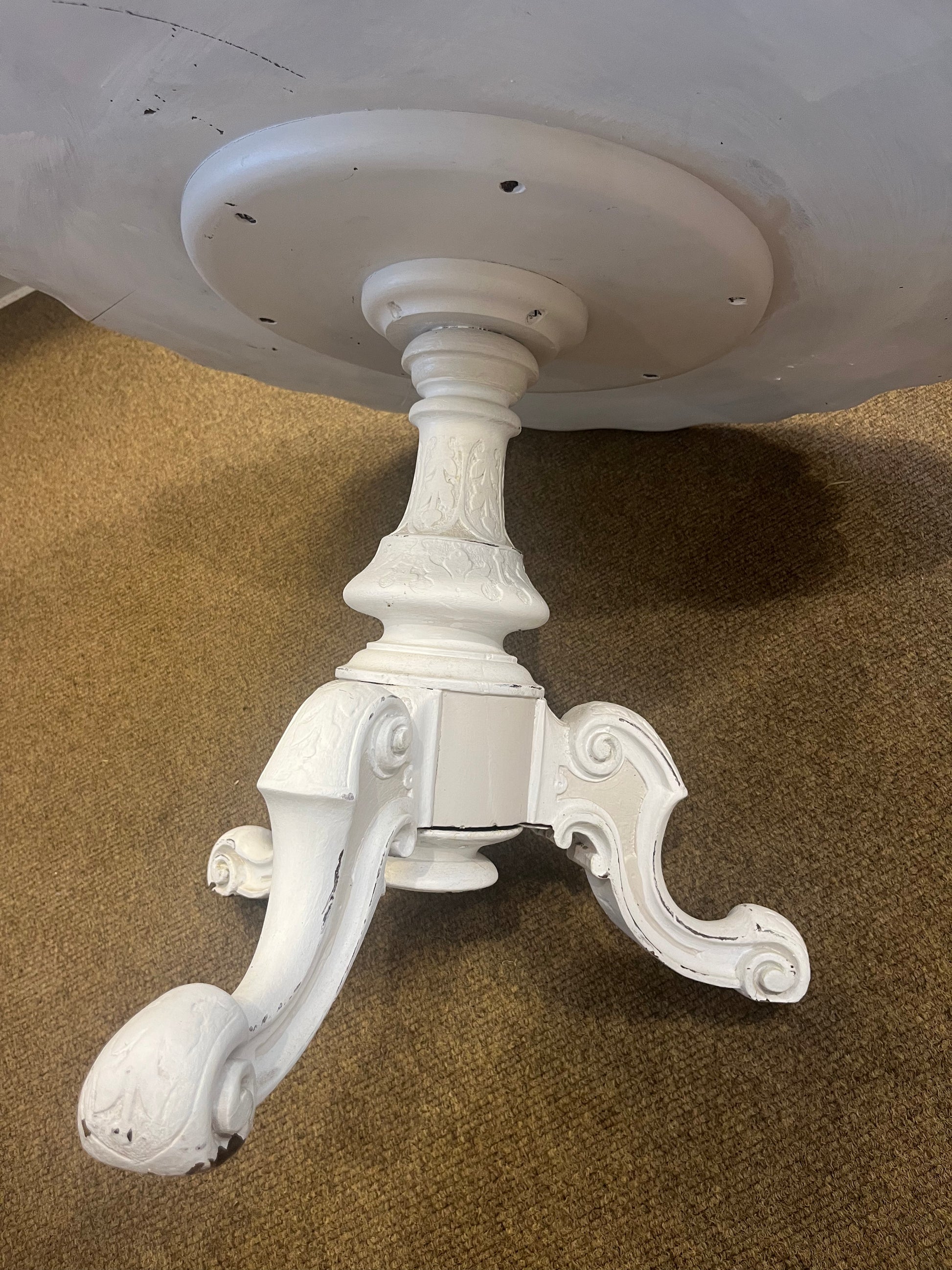 70 x 46 across top. There are a few little chippy bits and a small split, ( depicts the price) but sturdy and very pretty. Gorgeous pedestal leg. a mock up of how it could look in a home.